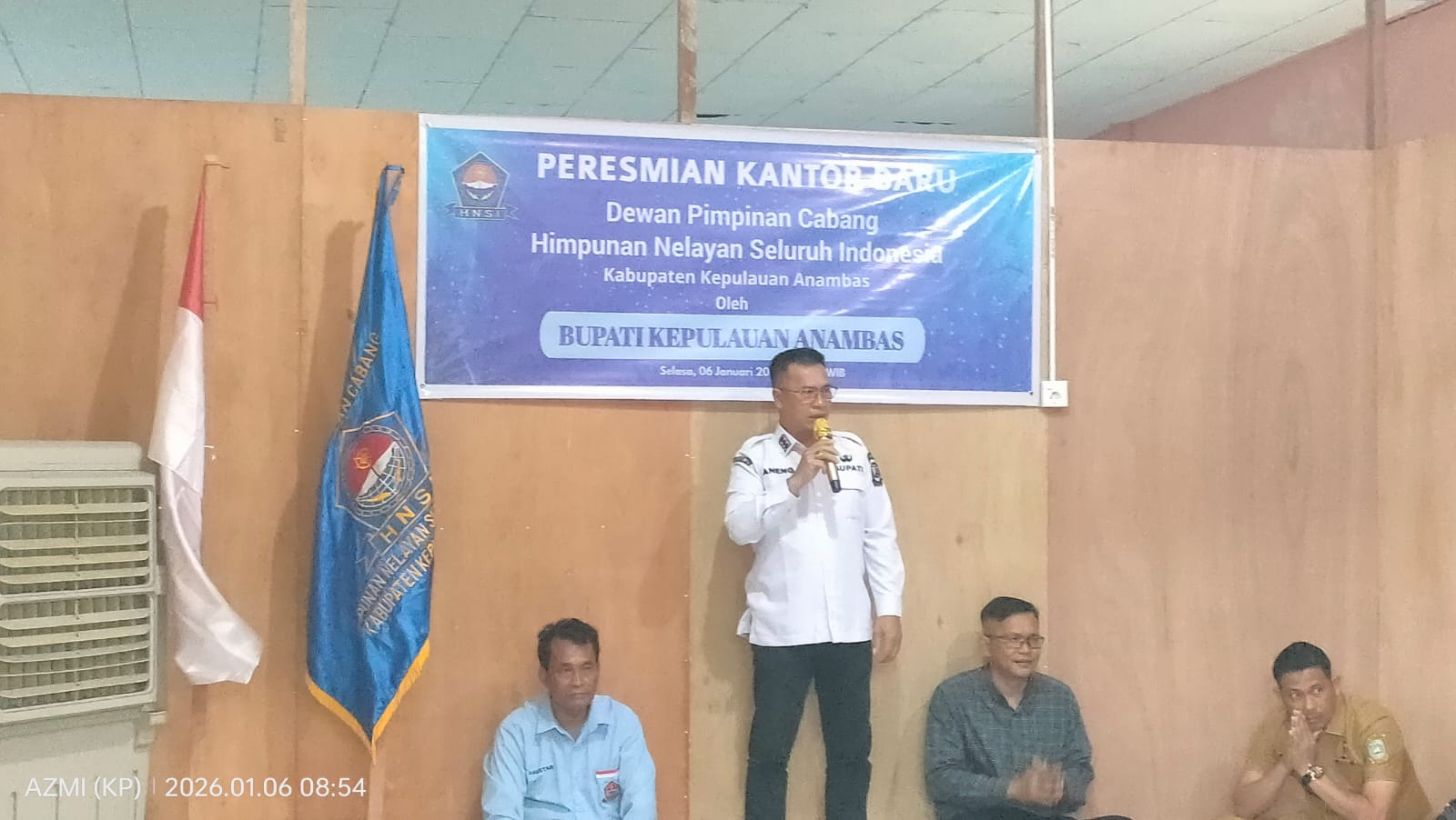 Bupati Kepulauan Anambas, Aneng, memberikan sambutan sekaligus meresmikan Kantor DPC Himpunan Nelayan Seluruh Indonesia (HNSI) Kabupaten Kepulauan Anambas di Balai Pertemuan Pelabuhan Perikanan Antang, Selasa (6/1/2026).