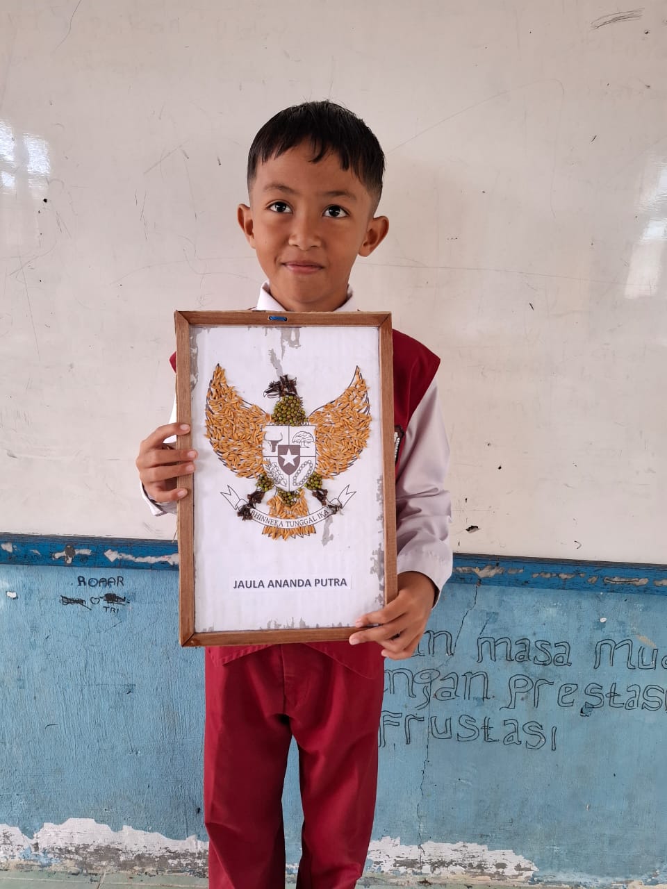 Tugas mandiri untuk siswa kelas 4 SD berupa pembuatan kolase dari biji-bijian dan daun kering. Total 11 siswa menerima penghargaan atas kreativitas dan ketekunan mereka.